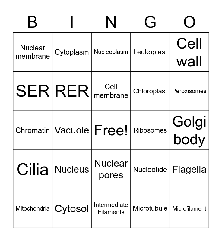 This bingo card has a free space and 24 words: Nucleus, Cytosol, Cell membrane, Mitochondria, Cell wall, Nuclear membrane, SER, Cytoplasm, Ribosomes, Nuclear pores, Chloroplast, Chromatin, Nucleotide, Flagella, RER, Microtubule, Golgi body, Nucleoplasm, Peroxisomes, Vacuole, Microfilament, Cilia, Leukoplast and Intermediate Filaments.