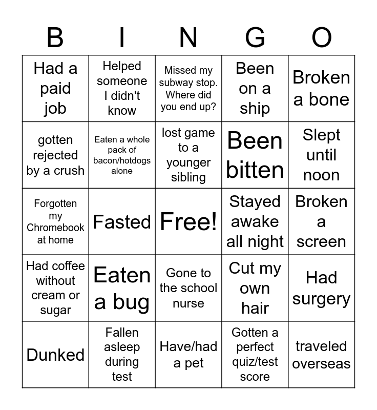 This bingo card has a free space and 24 words: Eaten a bug, Fallen asleep during test, lost game to a younger sibling, Dunked, Broken a bone, Had a paid job, gotten rejected by a crush, Helped someone I didn't know, Stayed awake all night, Gone to the school nurse, Been bitten, Forgotten my Chromebook at home, Cut my own hair, Had surgery, Eaten a whole pack of bacon/hotdogs alone, Gotten a perfect quiz/test score, Broken a screen, Missed my subway stop. Where did you end up?, Slept until noon, Fasted, traveled overseas, Had coffee without cream or sugar, Been on a ship and Have/had a pet.