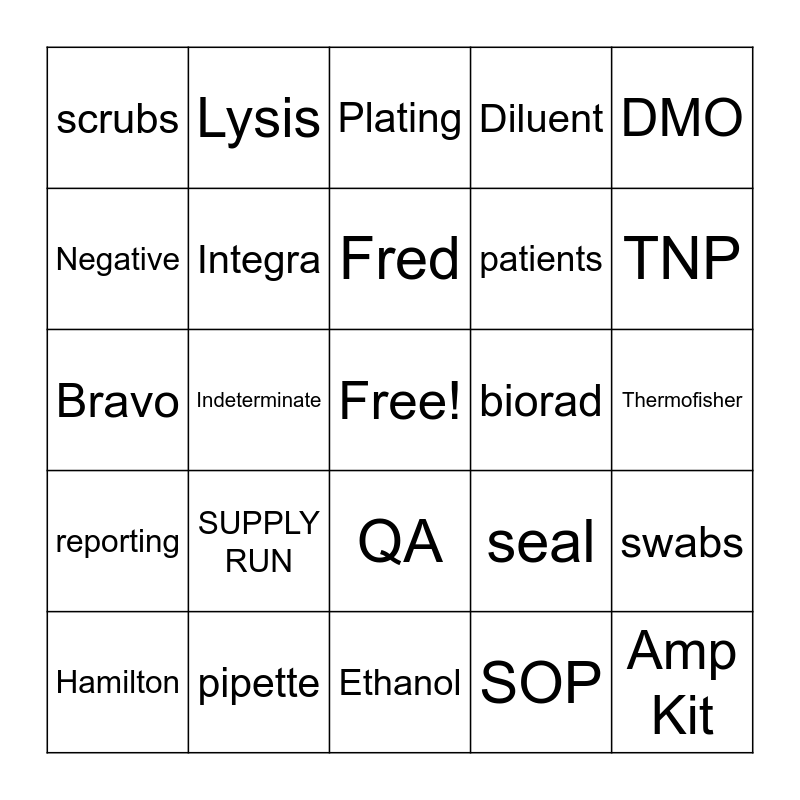 This bingo card has a free space and 74 words: Alinity, Accessioning, Plating, PCR, Extraction, COVID-19, KN95, Disinfection, Hamilton, Kingfisher, Abbott, San Dimas, Fred, Negative, Positive, Indeterminate, QNS, TNP, NCR, Bravo, Integra, Lysis, Diluent, Vapor Barrier, Amp Kit, Sample Prep, TCEP, BBD, Mastermix, Controls, DMO, Zymo, DAT, MediaLab, Metabase, SOP, Curative, BSC, Eppendorf, Bleach, Ethanol, pipette, vortex, Lab coat, goggles, scrubs, BIOSECURITY, SUPPLY RUN, CLS, CLA I, CLA II, wristband, Thermofisher, STAT, TAT, calibration, QA, maintenance, forceps, swabs, patients, LDT2, reporting, graduated cylinder, biorad, reagents, samples, CLADS, seal, competency, gloves, schedule, ukg and paycom.