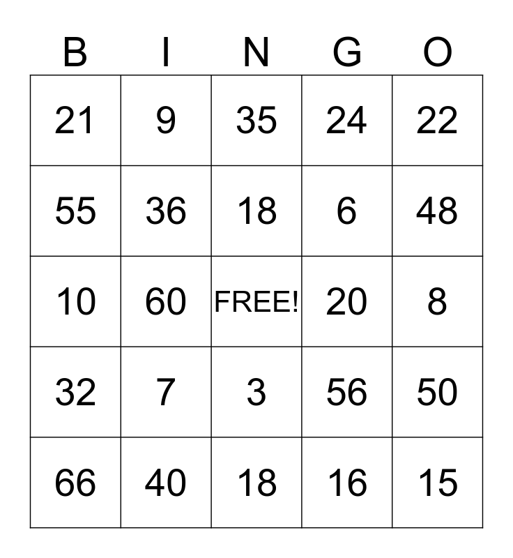 This bingo card has a free space and 24 words: 7, 40, 18, 66, 22, 21, 55, 9, 20, 3, 6, 10, 56, 50, 36, 16, 8, 35, 48, 60, 15, 32, 24 and 18.