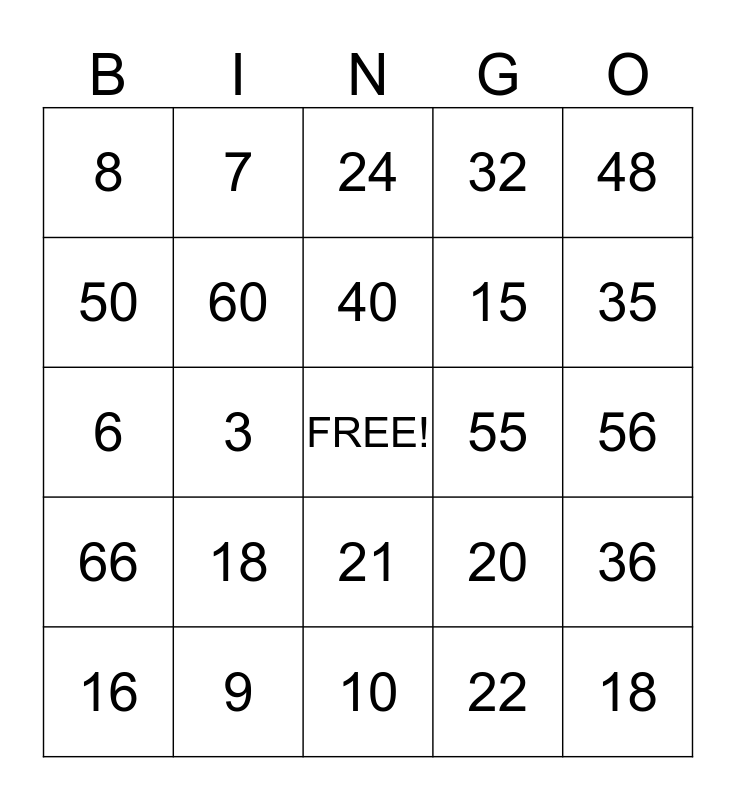 This bingo card has a free space and 24 words: 18, 9, 40, 16, 48, 8, 50, 7, 55, 21, 15, 6, 20, 36, 60, 22, 56, 24, 35, 3, 18, 66, 32 and 10.