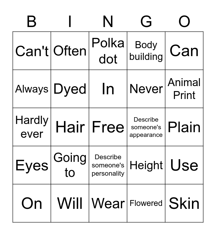 This bingo card has a free space and 24 words: Going to, Will, In, On, Can, Can't, Always, Often, Describe someone's appearance, Describe someone's personality, Never, Hardly ever, Height, Use, Dyed, Flowered, Plain, Polka dot, Animal Print, Hair, Skin, Eyes, Body building and Wear.