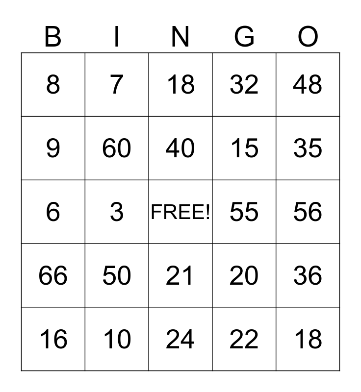 This bingo card has a free space and 24 words: 50, 10, 40, 16, 48, 8, 9, 7, 55, 21, 15, 6, 20, 36, 60, 22, 56, 18, 35, 3, 18, 66, 32 and 24.