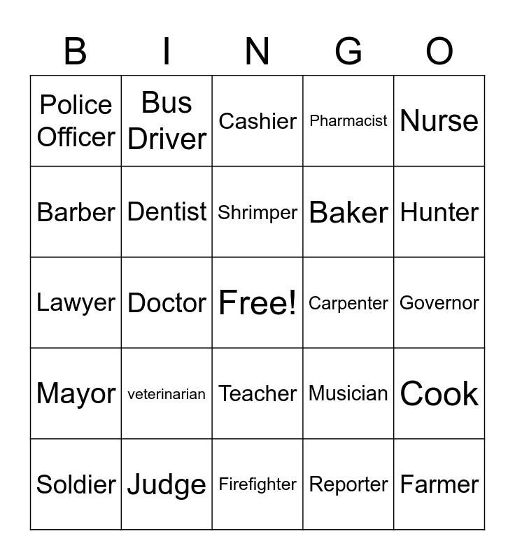 This bingo card has a free space and 24 words: veterinarian, Judge, Shrimper, Soldier, Nurse, Police Officer, Barber, Bus Driver, Carpenter, Teacher, Baker, Lawyer, Musician, Cook, Dentist, Reporter, Governor, Cashier, Hunter, Doctor, Farmer, Mayor, Pharmacist and Firefighter.