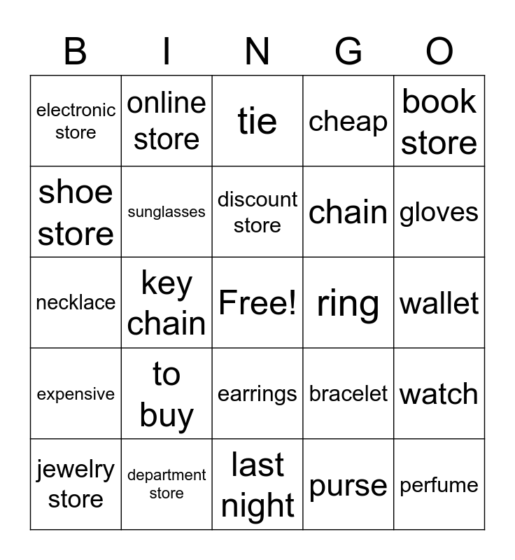 This bingo card has a free space and 24 words: to buy, department store, discount store, jewelry store, book store, electronic store, shoe store, online store, ring, earrings, chain, necklace, bracelet, watch, sunglasses, purse, wallet, tie, gloves, key chain, perfume, expensive, cheap and last night.