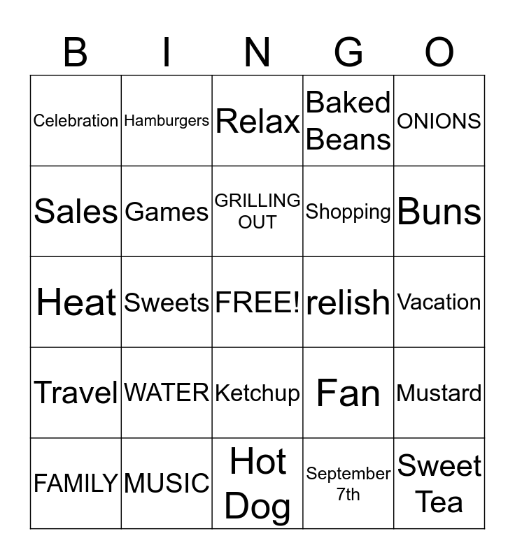 This bingo card has a free space and 24 words: WATER, MUSIC, GRILLING OUT, FAMILY, ONIONS, Celebration, Sales, Hamburgers, relish, Ketchup, Shopping, Heat, Fan, Mustard, Games, September 7th, Vacation, Relax, Buns, Sweets, Sweet Tea, Travel, Baked Beans and Hot Dog.