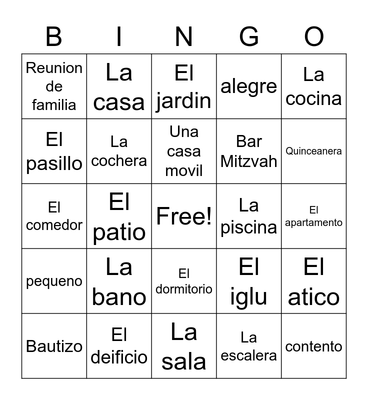 This bingo card has a free space and 24 words: La bano, El deificio, Una casa movil, Bautizo, La cocina, Reunion de familia, El pasillo, La casa, La piscina, El dormitorio, Bar Mitzvah, El comedor, El iglu, El atico, La cochera, La escalera, El apartamento, El jardin, Quinceanera, El patio, contento, pequeno, alegre and La sala.