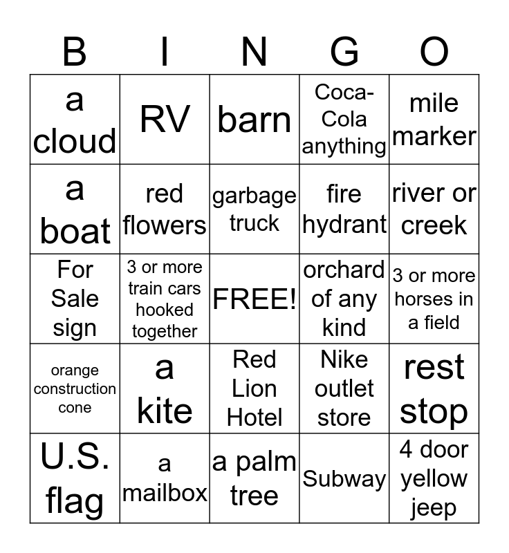 This bingo card has a free space and 24 words: a kite, a mailbox, garbage truck, U.S. flag, mile marker, a cloud, a boat, RV, orchard of any kind, Red Lion Hotel, fire hydrant, For Sale sign, Nike outlet store, rest stop, red flowers, Subway, 3 or more horses in a field, barn, river or creek, 3 or more train cars hooked together, 4 door yellow jeep, orange construction cone, Coca-Cola anything and a palm tree.