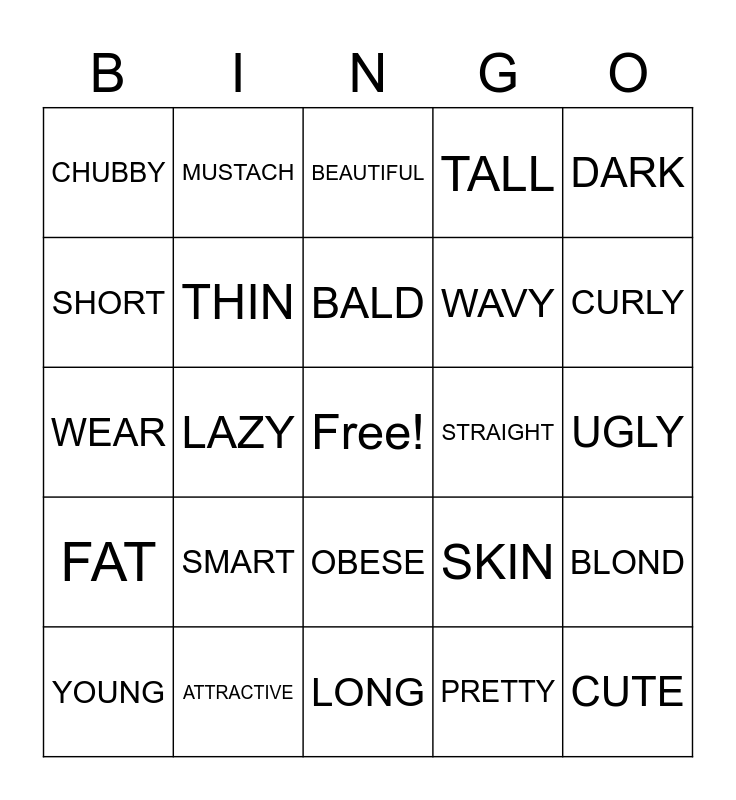 This bingo card has a free space and 24 words: SMART, ATTRACTIVE, BALD, YOUNG, DARK, CHUBBY, SHORT, MUSTACH, STRAIGHT, OBESE, WAVY, WEAR, SKIN, BLOND, THIN, PRETTY, UGLY, BEAUTIFUL, CURLY, LAZY, CUTE, FAT, TALL and LONG.
