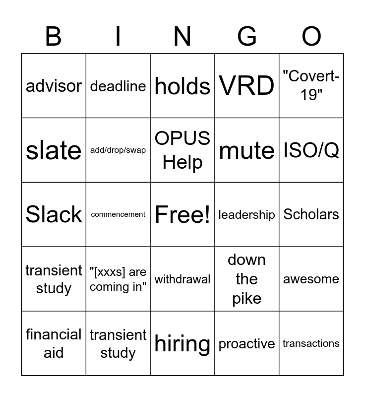 This bingo card has a free space and 50 words: modular, transactions, globably, hiring, "[xxxs] are coming in", chat, deadline, incompletes, slate, OneDrive, add/drop/swap, VRD, awesome, down the pike, Sure program, enrollment appointments, OPUS Help, leadership, shenanigans, "Covert-19", commencement, proactive, advisor, mute, flourishing, registrar, ISO/Q, application, holds, withdrawal, CBC, front desk, any old ambiguous pronoun reference, volunteer, transient study, Degree Tracker, withdrawal, College Weekly, Dean Elliott, Scholars, PHA, Any questions?, OISP, NS&FP, financial aid, Slack, exams, transfer credit, transient study and vacation.