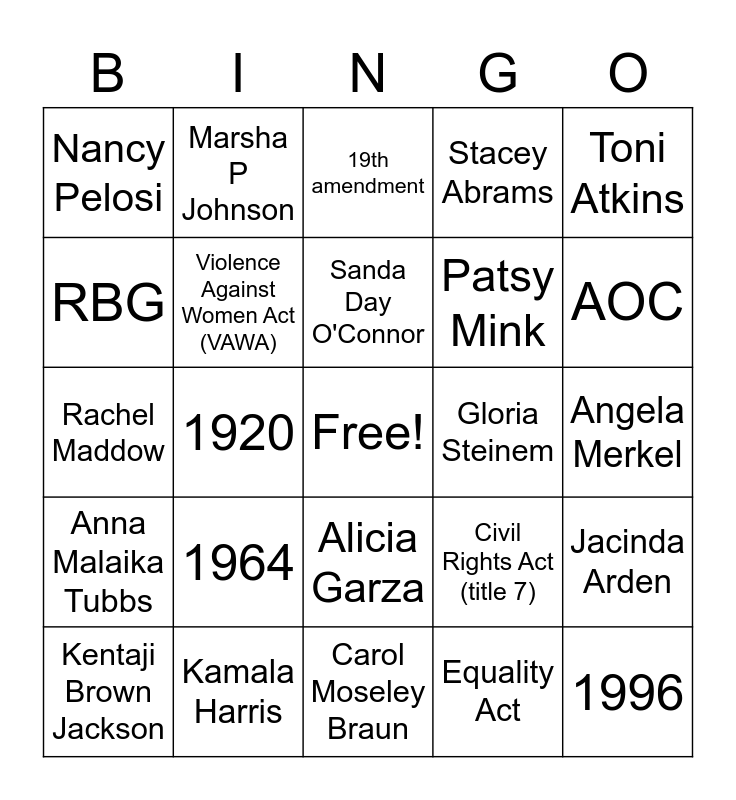 This bingo card has a free space and 24 words: 1964, Kamala Harris, Sanda Day O'Connor, Kentaji Brown Jackson, Toni Atkins, Nancy Pelosi, RBG, Marsha P Johnson, Gloria Steinem, Alicia Garza, Patsy Mink, Rachel Maddow, Civil Rights Act (title 7), Jacinda Arden, Violence Against Women Act (VAWA), Equality Act, Angela Merkel, 19th amendment, AOC, 1920, 1996, Anna Malaika Tubbs, Stacey Abrams and Carol Moseley Braun.