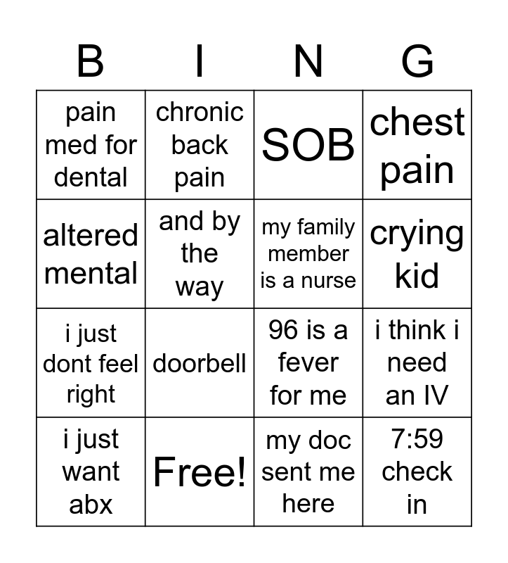 This bingo card has 16 words: Free!, i think i need an IV, SOB, pain med for dental, i just dont feel right, chronic back pain, 96 is a fever for me, my doc sent me here, altered mental, and by the way, i just want abx, chest pain, doorbell, crying kid, my family member is a nurse and 7:59 check in.