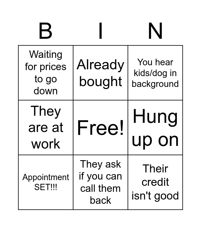 This bingo card has a free space and 8 words: Hung up on, You hear kids/dog in background, Already bought, Appointment SET!!!, Waiting for prices to go down, Their credit isn't good, They are at work and They ask if you can call them back.