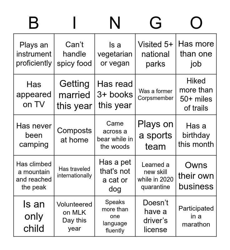 This bingo card has 25 words: Has traveled internationally, Speaks more than one language fluently, Has read 3+ books this year, Is an only child, Has more than one job, Plays an instrument proficiently, Has appeared on TV, Can’t handle spicy food, Plays on a sports team, Has a pet that's not a cat or dog, Was a former Corpsmember, Has never been camping, Learned a new skill while in 2020 quarantine, Owns their own business, Getting married this year, Participated in a marathon, Has a birthday this month, Is a vegetarian or vegan, Hiked more than 50+ miles of trails, Composts at home, Came across a bear while in the woods, Volunteered on MLK Day this year, Has climbed a mountain and reached the peak, Visited 5+ national parks and Doesn’t have a driver’s license.