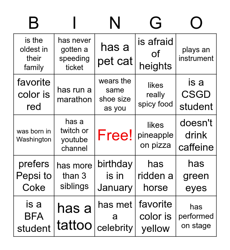 This bingo card has a free space and 34 words: hates chocolate, favorite color is yellow, has been to another country, can say the alphabet backwards, prefers Pepsi to Coke, has run a marathon, plays an instrument, is a BFA student, has never gotten a speeding ticket, can do a cartwheel, wears the same shoe size as you, has a pet cat, ate vegetables last night, loves horror movies, likes pineapple on pizza, is a CSGD student, has a tattoo, was born in Washington, has more than 3 siblings, has ridden a horse, birthday is in January, has not broken any bones, is the oldest in their family, doesn't drink caffeine, has met a celebrity, has performed on stage, is afraid of heights, favorite season is winter, likes really spicy food, favorite color is red, is afraid of spiders, has a twitch or youtube channel, has green eyes and can touch their tongue to their nose.