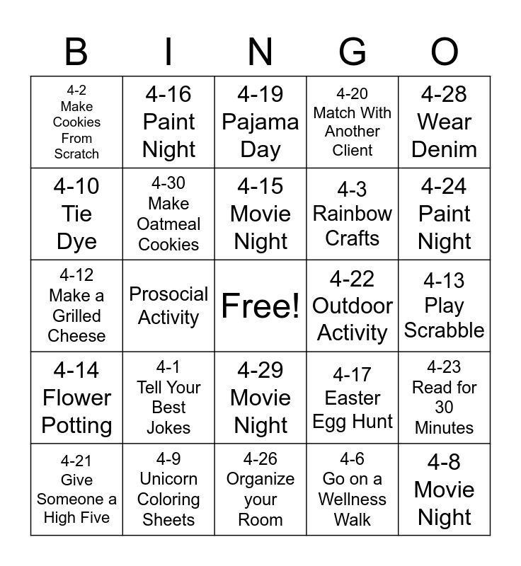 This bingo card has a free space and 24 words: 4-1 Tell Your Best Jokes, 4-9 Unicorn Coloring Sheets, 4-15 Movie Night, 4-21 Give Someone a High Five, 4-28 Wear Denim, 4-2 Make Cookies From Scratch, 4-10 Tie Dye, 4-16 Paint Night, 4-22 Outdoor Activity, 4-29 Movie Night, 4-3 Rainbow Crafts, 4-12 Make a Grilled Cheese, 4-17 Easter Egg Hunt, 4-23 Read for 30 Minutes, 4-30 Make Oatmeal Cookies, 4-6 Go on a Wellness Walk, 4-13 Play Scrabble, 4-19 Pajama Day, 4-24 Paint Night, Prosocial Activity, 4-8 Movie Night, 4-14 Flower Potting, 4-20 Match With Another Client and 4-26 Organize your Room.