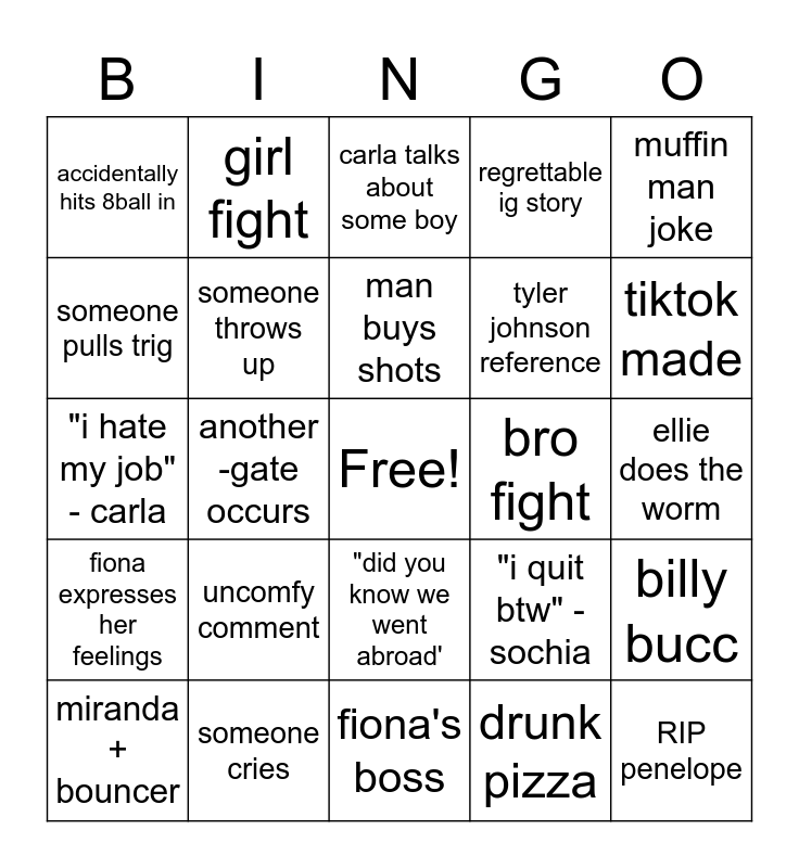 This bingo card has a free space and 24 words: uncomfy comment, someone cries, man buys shots, miranda + bouncer, muffin man joke, accidentally hits 8ball in, someone pulls trig, girl fight, bro fight, "did you know we went abroad', tyler johnson reference, "i hate my job" - carla, "i quit btw" - sochia, billy bucc, someone throws up, drunk pizza, ellie does the worm, carla talks about some boy, tiktok made, another -gate occurs, RIP penelope, fiona expresses her feelings, regrettable ig story and fiona's boss.