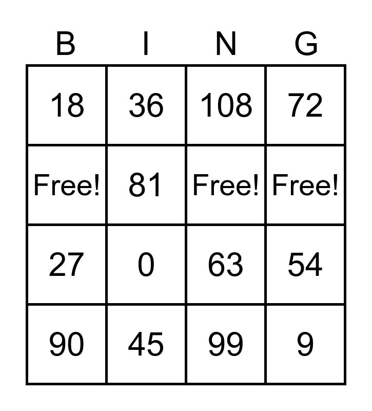 This bingo card has 16 words: 45, 54, 108, 18, 27, 36, 63, 99, Free!, 81, 90, 72, 0, Free!, Free! and 9.