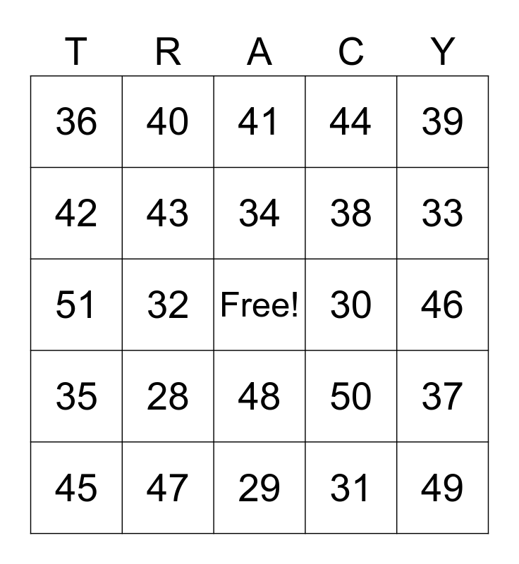 This bingo card has a free space and 24 words: 28, 47, 34, 45, 39, 36, 42, 40, 30, 48, 38, 51, 50, 37, 43, 31, 46, 41, 33, 32, 49, 35, 44 and 29.