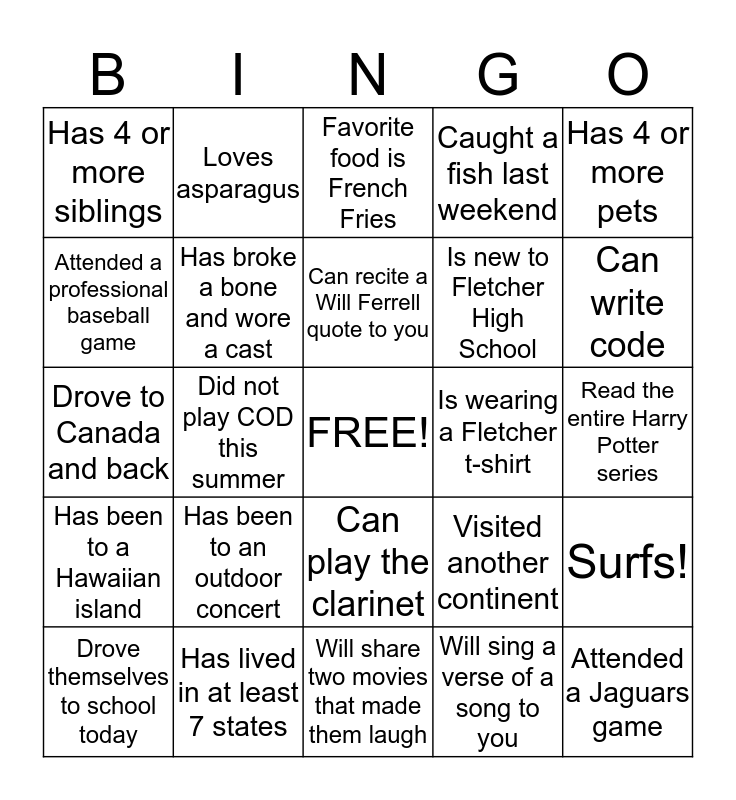 This bingo card has a free space and 24 words: Has been to an outdoor concert, Has lived in at least 7 states, Can recite a Will Ferrell quote to you, Drove themselves to school today, Has 4 or more pets, Has 4 or more siblings, Attended a professional baseball game, Loves asparagus, Is wearing a Fletcher t-shirt, Can play the clarinet, Is new to Fletcher High School, Drove to Canada and back, Visited another continent, Surfs!, Has broke a bone and wore a cast, Will sing a verse of a song to you, Read the entire Harry Potter series, Favorite food is French Fries, Can write code, Did not play COD this summer, Attended a Jaguars game, Has been to a Hawaiian island, Caught a fish last weekend and Will share two movies that made them laugh.