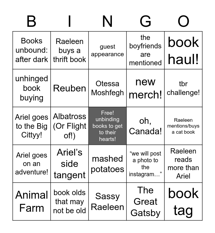 This bingo card has a free space and 24 words: Ariel’s side tangent, book olds that may not be old, Otessa Moshfegh, Animal Farm, book haul!, Books unbound: after dark, unhinged book buying, Raeleen buys a thrift book, oh, Canada!, mashed potatoes, new merch!, Ariel goes to the Big Cittyy!, “we will post a photo to the instagram…”, Raeleen reads more than Ariel, Reuben, The Great Gatsby, Raeleen mentions/buys a cat book, guest appearance, tbr challenge!, Albatross (Or Flight of!), book tag, Ariel goes on an adventure!, the boyfriends are mentioned and Sassy Raeleen.