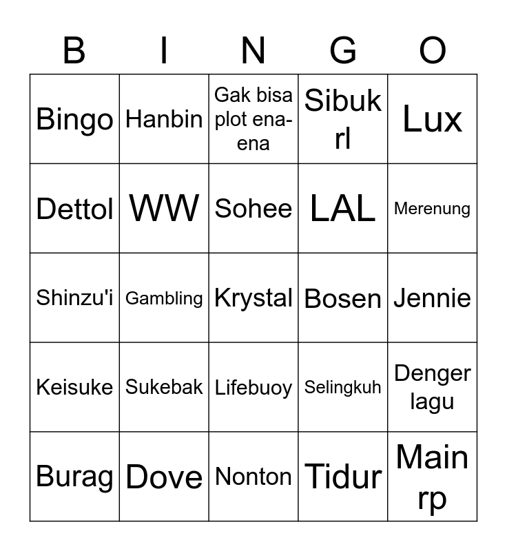 This bingo card has a free space and 24 words: Sukebak, Dove, Sohee, Burag, Lux, Bingo, Dettol, Hanbin, Bosen, Lifebuoy, LAL, Shinzu'i, Selingkuh, Denger lagu, WW, Tidur, Jennie, Gak bisa plot ena-ena, Merenung, Gambling, Main rp, Keisuke, Sibuk rl and Nonton.