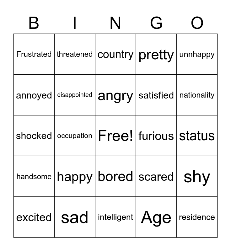 This bingo card has a free space and 24 words: happy, sad, angry, excited, unnhappy, Frustrated, annoyed, threatened, furious, bored, satisfied, shocked, scared, shy, disappointed, Age, status, country, nationality, occupation, residence, handsome, pretty and intelligent.