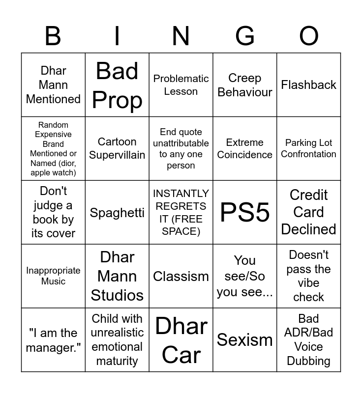 This bingo card has a free space and 51 words: Continuity Error, Bad ADR/Bad Voice Dubbing, Merch in Video, Dhar Car, Dhar Mann Studios, Kids With IPad, Bad Prop, Oblivious Parent with Demon Child, Random Expensive Brand Mentioned or Named (dior, apple watch), Clearly in the wrong person has an attitude, Cartoon Supervillain, Creep Behaviour, Doesn't pass the vibe check, You see/So you see..., "What's in the dark will always come into the light", Checkov's _______, End quote unattributable to any one person, PS5, Time Skip, Flashback, Spaghetti, Sexism, Dhar Mann Mentioned, Extreme Coincidence, Someone Fired over something small, "How would you feel if that had happened to you/Treat others how you want to be treated", Parking Lot Confrontation, Dhar Mann Voiceover, "I am the manager.", Problematic Lesson, Husband is Fired, secretly rich, Random dramatic and emotional monologue, Bad Sound Effects, Unreasonably Calm & Forgiving, Child with unrealistic emotional maturity, Somebody is evicted, Bad Green Screen, Check Bounces, Comically Unreasonable Person, Credit Card Declined, Inappropriate Music, Mall Set, Names that are a little TOO on the nose, Random Celebrity/Influencer appearance, Someone asks for forgiveness, Don't judge a book by its cover, Dhar Mann quotes himself, Racism, Classism and Rags to Riches.