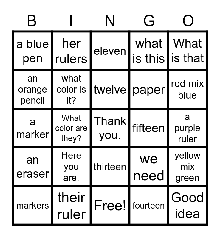 This bingo card has 25 words: an eraser, their ruler, Thank you., fourteen, What is that, a blue pen, her rulers, eleven, fifteen, yellow mix green, an orange pencil, what color is it?, Free!, we need, red mix blue, markers, What color are they?, twelve, paper, a purple ruler, a marker, Here you are., thirteen, what is this and Good idea.