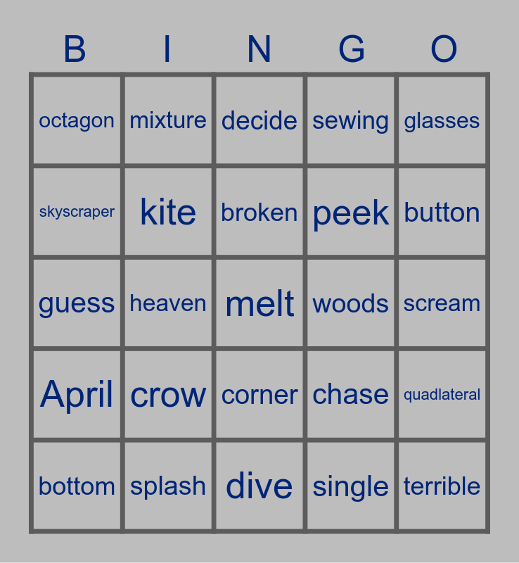 This bingo card has 76 words: Free!, pour, decide, cover, calendar, pebble, shiver, surprise, attic, fix, terrible, custard, broken, skyscraper, mouthful, heaven, bounce, melt, whisper, glasses, icicle, guess, kite, mixture, sewing, rake, sphere, cylinder, slip, behind, cone, delicious, sled, chase, button, peek, hurry, brought, scream, single, lick, lantern, pyramid, rhyme, worry, alone, bottom, octagon, porch, November, bought, corner, splattered, squirrel, stump, pentagon, cube, pleased, mailbox, window, crow, knock, locked, shade, mirror, horns, woods, wonderful, answer, camping, quadlateral, April, splash, dragonfly, dive and spring.