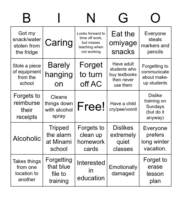 This bingo card has a free space and 45 words: Was extremely hungover the second day of the training, Forget to erase lesson plan, Grumble about long drives for some trainings, Takes things from one location to another, Everyone sometimes sings Super Simple Songs in the shower or bath, Emotionally damaged, Looks forward to time off work, but misses teaching when not working, Not putting back things where they were at first, Everyone steals markers and pencils, Forgetting that blue file to training, Eat the omiyage snacks, Have a child cry/pee/vomit, Forgets to clean up homework cards, Tripped the alarm at Minami school, Everyone sometimes walks in the no-shoe area with shoes when nobody else is around, Interested in education, Annoying, Forgets to reimburse their receipts, Constantly coming up with great ideas during a lesson that disappear from your mind by the end, Forgetting to communicate about make-up students, Caring, No one likes to wake up early every Saturday, MY staff give meaningful advice to each other when needed, Got my snack/water stolen from the fridge, Mess up the FO card order, Dislike training on Sundays (but do it anyway), Have a student suddenly come for make-up without warning, Checks work e-mail every workday, Dislikes extremely quiet classes, Alcoholic, Leave cans/bottles you drank at schools, Everyone prefers long winter vacation., Had to return to school to check whether I turned the AC/lights off, Can't get any forms done without Megumi, Go out for Barbeques/Drinking, Cleans things down with alcohol spray, Having good intention deep inside, Likes to try new things, Full of self loathing, Forget to turn off AC, Stole a piece of equipment from the school, Have adult students who buy textbooks then never use them, Forgets whether they checked a student's homework right after checking it due to getting distracted, Barely hanging on and Has high standards.