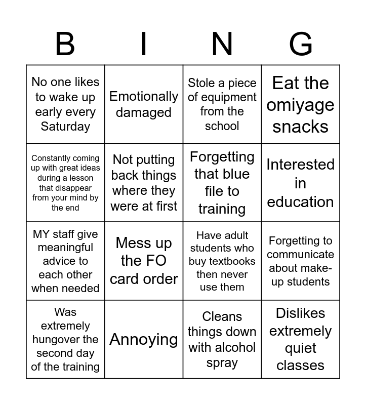 This bingo card has 46 words: Free!, Was extremely hungover the second day of the training, Forget to erase lesson plan, Grumble about long drives for some trainings, Takes things from one location to another, Everyone sometimes sings Super Simple Songs in the shower or bath, Emotionally damaged, Looks forward to time off work, but misses teaching when not working, Not putting back things where they were at first, Everyone steals markers and pencils, Forgetting that blue file to training, Eat the omiyage snacks, Have a child cry/pee/vomit, Forgets to clean up homework cards, Tripped the alarm at Minami school, Everyone sometimes walks in the no-shoe area with shoes when nobody else is around, Interested in education, Annoying, Forgets to reimburse their receipts, Constantly coming up with great ideas during a lesson that disappear from your mind by the end, Forgetting to communicate about make-up students, Caring, No one likes to wake up early every Saturday, MY staff give meaningful advice to each other when needed, Got my snack/water stolen from the fridge, Mess up the FO card order, Dislike training on Sundays (but do it anyway), Have a student suddenly come for make-up without warning, Checks work e-mail every workday, Dislikes extremely quiet classes, Alcoholic, Leave cans/bottles you drank at schools, Everyone prefers long winter vacation., Had to return to school to check whether I turned the AC/lights off, Can't get any forms done without Megumi, Go out for Barbeques/Drinking, Cleans things down with alcohol spray, Having good intention deep inside, Likes to try new things, Full of self loathing, Forget to turn off AC, Stole a piece of equipment from the school, Have adult students who buy textbooks then never use them, Forgets whether they checked a student's homework right after checking it due to getting distracted, Barely hanging on and Has high standards.