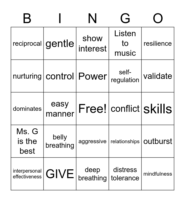 This bingo card has a free space and 24 words: belly breathing, GIVE, Power, interpersonal effectiveness, resilience, reciprocal, nurturing, gentle, conflict, aggressive, self-regulation, dominates, relationships, outburst, control, distress tolerance, skills, show interest, validate, easy manner, mindfulness, Ms. G is the best, Listen to music and deep breathing.