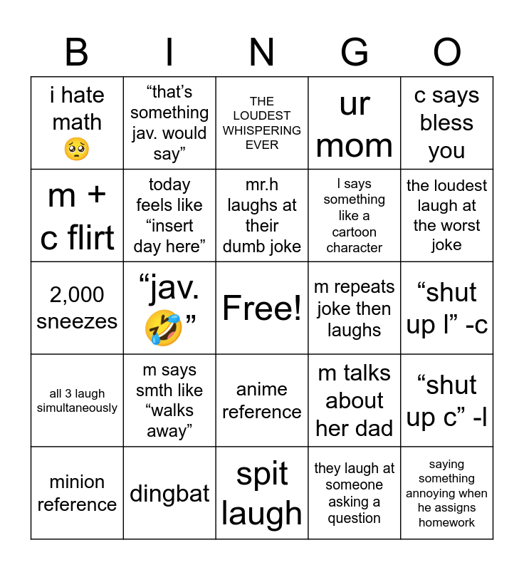 This bingo card has a free space and 27 words: m talks about her dad, c moans after cracking back, l says something like a cartoon character, spit laugh, m + c flirt, THE LOUDEST WHISPERING EVER, “that’s something jav. would say”, all 3 laugh simultaneously, m repeats joke then laughs, “shut up c” -l, 2,000 sneezes, ur mom, minion reference, dingbat, the loudest laugh at the worst joke, *random cringey noise*, today feels like “insert day here”, mr.h laughs at their dumb joke, m says smth like “walks away”, i hate math 🥺, “shut up l” -c, they laugh at someone asking a question, “jav. 🤣”, saying something annoying when he assigns homework, anime reference, c says bless you and m curses aggressively.