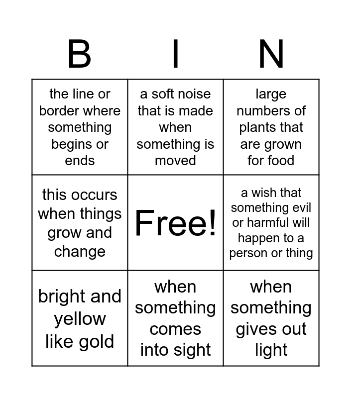 This bingo card has a free space and 10 words: when something comes into sight, large numbers of plants that are grown for food, the line or border where something begins or ends, when something gives out light, this occurs when things grow and change, bright and yellow like gold, a soft noise that is made when something is moved, steps in a process, a wish that something evil or harmful will happen to a person or thing and the good name that you earn by doing what is right.