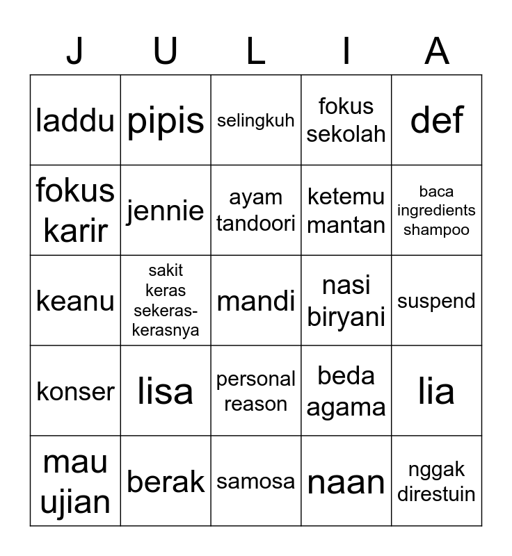 This bingo card has a free space and 24 words: lisa, berak, ayam tandoori, mau ujian, def, laddu, fokus karir, pipis, nasi biryani, personal reason, ketemu mantan, keanu, beda agama, lia, jennie, naan, suspend, selingkuh, baca ingredients shampoo, sakit keras sekeras-kerasnya, nggak direstuin, konser, fokus sekolah and samosa.