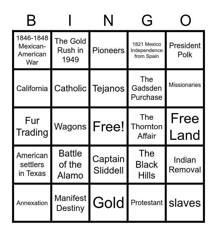 This bingo card has a free space and 24 words: Battle of the Alamo, Manifest Destiny, Tejanos, Annexation, President Polk, 1846-1848 Mexican-American War, California, The Gold Rush in 1949, The Thornton Affair, Captain Sliddell, The Gadsden Purchase, Fur Trading, The Black Hills, Indian Removal, Catholic, Protestant, Free Land, Pioneers, Missionaries, Wagons, slaves, American settlers in Texas, 1821 Mexico Independence from Spain and Gold.