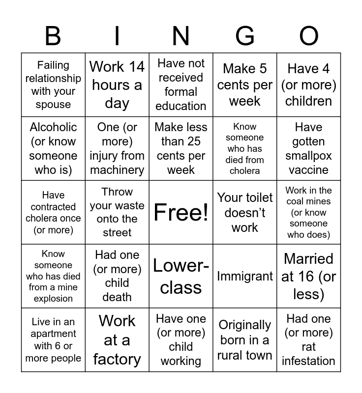 This bingo card has a free space and 24 words: Had one (or more) child death, Work at a factory, Make less than 25 cents per week, Live in an apartment with 6 or more people, Have 4 (or more) children, Failing relationship with your spouse, Alcoholic (or know someone who is), Work 14 hours a day, Your toilet doesn’t work, Lower-class, Know someone who has died from cholera, Have contracted cholera once (or more), Immigrant, Married at 16 (or less), One (or more) injury from machinery, Originally born in a rural town, Work in the coal mines (or know someone who does), Have not received formal education, Have gotten smallpox vaccine, Throw your waste onto the street, Had one (or more) rat infestation, Know someone who has died from a mine explosion, Make 5 cents per week and Have one (or more) child working.
