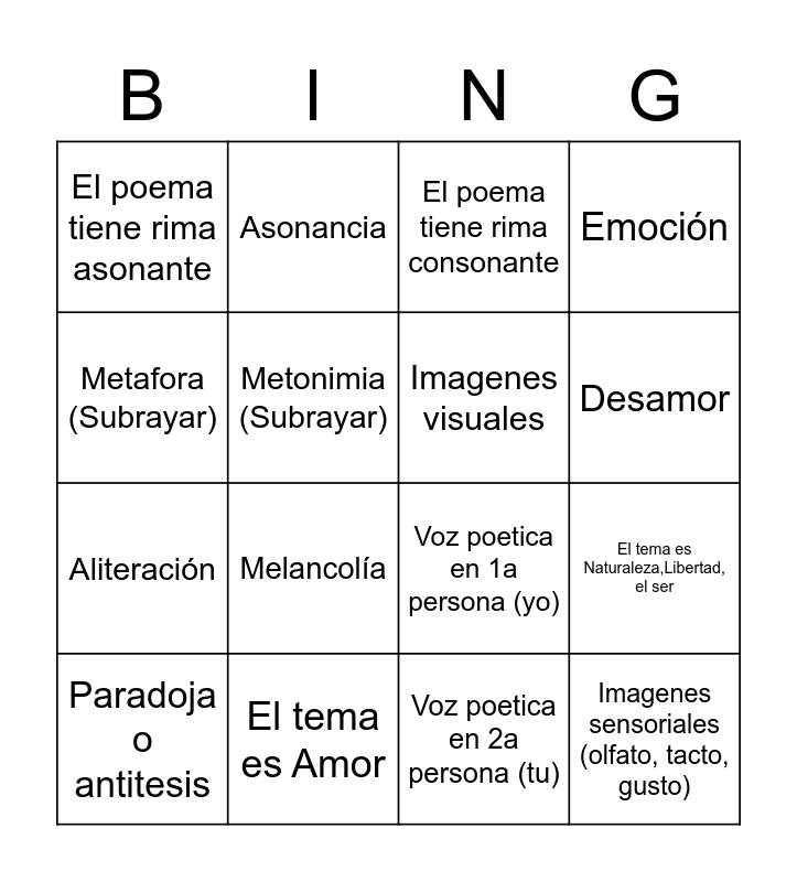 This bingo card has 16 words: El tema es Amor, El tema es Naturaleza,Libertad, el ser, El poema tiene rima consonante, El poema tiene rima asonante, Aliteración, Asonancia, Voz poetica en 1a persona (yo), Voz poetica en 2a persona (tu), Metafora (Subrayar), Metonimia (Subrayar), Paradoja o antitesis, Emoción, Melancolía, Desamor, Imagenes visuales and Imagenes sensoriales (olfato, tacto, gusto).