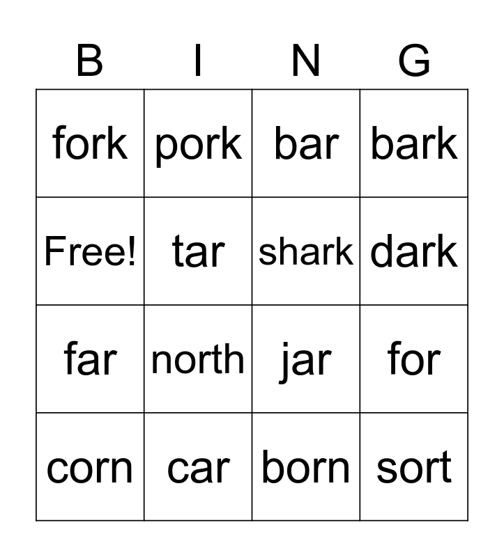 This bingo card has 16 words: car, for, bar, fork, far, pork, jar, born, Free!, tar, corn, bark, north, dark, shark and sort.