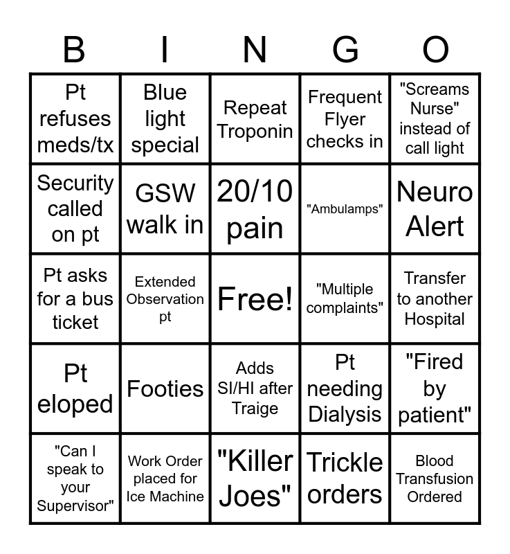 This bingo card has a free space and 25 words: Footies, "Killer Joes", 20/10 pain, "Can I speak to your Supervisor", "Screams Nurse" instead of call light, Pt refuses meds/tx, Security called on pt, Blue light special, "Multiple complaints", Adds SI/HI after Traige, "Ambulamps", Pt asks for a bus ticket, Pt needing Dialysis, "Fired by patient", GSW walk in, NPO, Transfer to another Hospital, Repeat Troponin, Neuro Alert, Extended Observation pt, Blood Transfusion Ordered, Work Order placed for Ice Machine, Pt eloped, Frequent Flyer checks in and Trickle orders.
