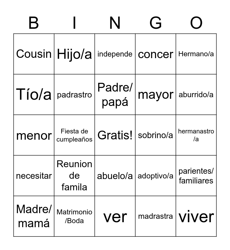 This bingo card has a free space and 24 words: Reunion de famila, Matrimonio /Boda, Padre/ papá, Madre/ mamá, Hermano/a, Cousin, Tío/a, Hijo/a, sobrino/a, abuelo/a, mayor, menor, adoptivo/a, parientes/ familiares, padrastro, madrastra, hermanastro /a, independe, aburrido/a, Fiesta de cumpleaños, viver, necesitar, concer and ver.