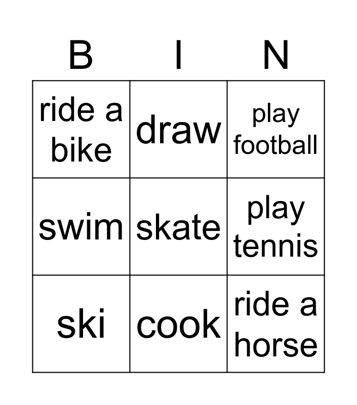 This bingo card has a free space and 11 words: climb a tree, cook, ride a horse, ski, draw, play football, play tennis, play the guitar, swim, ride a bike and play the piano.