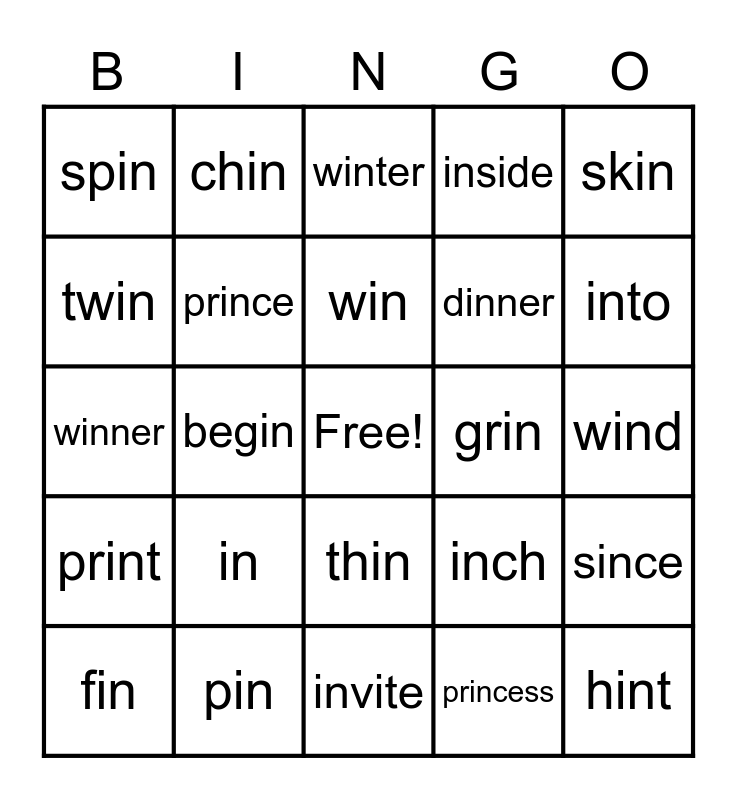 This bingo card has a free space and 24 words: in, pin, win, fin, skin, spin, twin, chin, grin, thin, dinner, winner, inch, since, prince, princess, wind, winter, into, begin, hint, print, inside and invite.