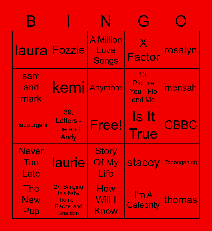 This bingo card has a free space and 536 words: brosnan, hayley, white, rebecca, You Know I'm No Good, Music, robbins, Rock DJ, merrett, Waterline, alexander, Could It Be Magic, Patience, ben c, antonio, Beat It, Don't Stop Me Now, warden, 31. Never sky - Gio and Rob, This Is Me, haygarth, Sometimes, I'll Stand By You, Life of Riley, louise, One and One, Wrecking Ball, laura, martin, The Show, 18. Princess things - me and Beckie, Jump Jump Star, Me And My Broken Heart, walsh, 51. Tap tap tap your feet - me and Beckie, 45. Mighty Little Gekko - Dave and Amy, jen, gardiner, heys, Slipping Through My Fingers, burnell, Fozzie, gio, lauren b, maisie, Touch, angela, Unpredictable, Breaking Free, abi, 2. Bubbly Blue - Gio and Andy, hill, 29. Upside-downsy Conga - Pete and Hannah, zenko, moran, Paw Patrol, tal, dianne, ryan r, pilak, I Begin to Wonder, helena t, Cheap Thrills, YMCA, griffin, Dear Darlin, Ruff Ruff Tweet and Dave, cerrie, paris, lynch, shankar, jail s, dan, rachel, Rewrite The Stars, Long Hot Summer, The Masked Singer, snell, Heroes, Relight My Fire, Rehab, Flames, Black Magic, I Wish It Could Be Xmas, 40. Choo-choo boogie - Rob and James, tull, buckle, Rolling In The Deep, Lush Life, Call Me, Nick Jr, Somebody Else's Guy, Steady and Slow, Family, 38. Make some noise - Grace and me, cameron, Start up your imagination, Better The Devil you Know, 30. Tots Theme - Rob me and Rachel, 49. I don't know what I've been told - me Rachel Rob and Flo, Unpredictable, aljaz, clark, michelle, feliciello, Like It, Nativity 3, sofia, michael, carbine, Sound Of The Underground, Love at first sight, Heart Skips a Beat, zu, lilia, 8. Count on Us - Flo and Hannah, kimberley m, joe, paul, keatley, natalie, 55. Chugga chugga - Grace and Rob, Super Trouper, rachel b, andy b, Newsround, evie, hou, 46. I belong - me and Jo, alana, Na Na Hey Hey Kiss Him Goodbye, I Think Were Alone Now, rob, jarvis, elaine, Tiger Feet, I'm Still Standing, Do They Know It's Christmas, 37. Stuffy the Great - Hannah and me, Shackles, damian, 17. Walking the plank - Andy and Rob, 25. The summer dances - everyone, Oops I Did It Again, 33. Ready for action - me and Eve, Call Me, chinyanganya, Happy Now, No More Tears Enough, yeadon, gooding, Kermit, Burn, jozi, When You're Gone, evans, cat, Bass Face, So am I, 60. Take over the world - Paul and me, What I've Been Looking For, Cha Cha Slide, zeroual, Alive, william, lloyd, anna, olivia, Never Too Late, daniel, You Don't Know Love, Back to Black, Bop To The Top, Toxic, danyl, mensah, All About The Bass, hlabourgani, Nativity 2, du beke, bella, rishab, 9. Super singing Heroes - Rachel and David, cullen, How Will I Know, No, eve g, nat, A Moment Like This, manrara, nathan, Man I Feel Like A woman, pritchard, henry, radzi, Hi-5, russell, Muppet Babies, Feelings, ramos, Gonzo, glover, Dance With Me Tonight, shanequa, Yoga, dwayne, Geno, I Turn to You, ribi, upton, 1. Hot Dog - James and Melissa, kennedy, 26. The hugglemonster way - Rachel and Rob, majeks, thompson, laurie, oti, aj, kevin, 32 . Kermit - me and Pete, The Greatest Dancer, shires, Please Don't Let Me Go, 44. Never land pirate band - Gio and Beckie, Fozzie - Me and Thomas, mccourt, Don't Leave Me This Way, 59. I'm Luna girl - me and Rachel, 54. I've got pizzazz - me and Louise, melissa, grkinic, Smile Please, Euphoria, 4. Seasons - Rachel and Andy, The New Pup, kimberley, buxton, Ooh la la, Playtime, hylton, cajee, coyle, Nothing Scares Me, ellie, Animal - me and Andy, colin, green, 22. Spine Chiller - Ben and Rob, beckie, Nativity, andy h, 27. Bringing this baby home - Rachel and Brandon, Tobogganing, Rule The World, Does Your Mother Know, Last Thing On My Mind, St Trinians, jls, saville, 23. Anything - Rachel and me, Never have to say goodbye, Story Of My Life, 42. Start of your imagination - me and Rachel, Cest la Vie, nola, emily, thorpe, gill, ryan c, leah, mitchell, daniels, Strictly, alfie, Love Machine, Sparky Come Back to Me, walker, The Promise, dowden, 7. Hero - Me and Rachel, Dancing On Ice, nilini, hassall, quigg, bokor, 36. Cedric the Great - rob and Paul, hargreaves, diana, bannister, CBBC, 5. Beach night party - Pete and Rob, smith, Fly On The Wings of Love, Summer's Lullaby, nixon and rhodes, sahota, Love Me Like You Do, Chain Reaction, carys, Venus, caroline, james, 6. Get up and dance - Me and Richie, amy t, whittaker, 15. Picture perfect - Phil and Louise, sherman, 11. Everyday fun - Beckie and Me, winters, birchenough, Friends, ricky, lauren, Is It True, Eurovision, o brien, Lipstick, kemi, ben w, mel, adeyike burford, boleto, Senses, 24. PJ masks and feeling great - Pete and Andy, 20. Super moves - Thomas me and Rachel, With Ur Love, katy, mum, CITV, Don't Stop Believin, cheryl, ayshah, lynn, 10. Picture You - Flo and Me, Scrambled, If I Were A Boy, Ballet, 17, Dynamite, Lazy Song, 28. A bicycle built for two - James and Brandon, mabuse, anton, roberts, Something New, Grace Kelly, daniel s, The Scientist, Night Is Young, dad, jenny, 48. Hello Christmas - me and Rachel, Steady and Slow, 41. KC's lullaby - me and Rachel, sam and mark, 39. Letters - me and Andy, adkaram, Scared of the Dark, gabby, Roar, pickerill, kerry, aolin, Set Fire To The Rain, williamson, 13. I can't cuddle - Andy and Flo, nicola, buswell, I'm on the Case, Young Hearts Run Free, eoghan, burke, anouska, You Are Not Alone, brown, vitto, shepherdson, At Last, 12. I've been there buddy - Rob and Rachel, thomas, pringle, Piggy - Jo and me, noah, clifton, Hallelujah, Waterloo, Penguin with A Plan, Reggaeton Lento, 52. Pirates Island hideout - Gio and Rachel, Summer, olly, heath, doran, kay, ben s, 14. Minnie's boutique - me and Elaine, karim, connor, sitkin, Tell Me Ma, marshall, Hero, Raining Sunshine, sandion, X Factor, A Million Love Songs, bainbridge, amy d, Amarillo, Something Kinda Ooh, eve b, 56. I'm on the case - me and Rachel, Cartoonito, murs, When Love Takes Over, Shine, Stay The Night, Let Me Down, Honey Honey, PJ Masks, cen