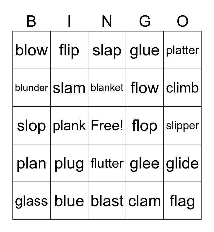 This bingo card has a free space and 34 words: black, clam, flat, glad, plan, slam, platter, glass, flip, clap, blanket, slap, play, glow, flop, climb, blue, slop, plug, glee, flutter, clever, blow, slipper, blast, flag, glue, plumber, flow, blunder, slot, plank, glide and flop.