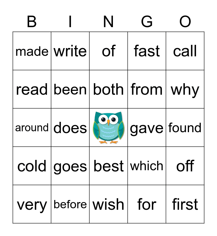 This bingo card has a free space and 40 words: always, around, because, been, before, best, both, buy, call, cold, does, fast, first, found, gave, goes, owl, made, many, of, off, for, from, read, right, sing, sleep, tell, these, those, upon, very, wash, which, why, wish, would, work, write and your.