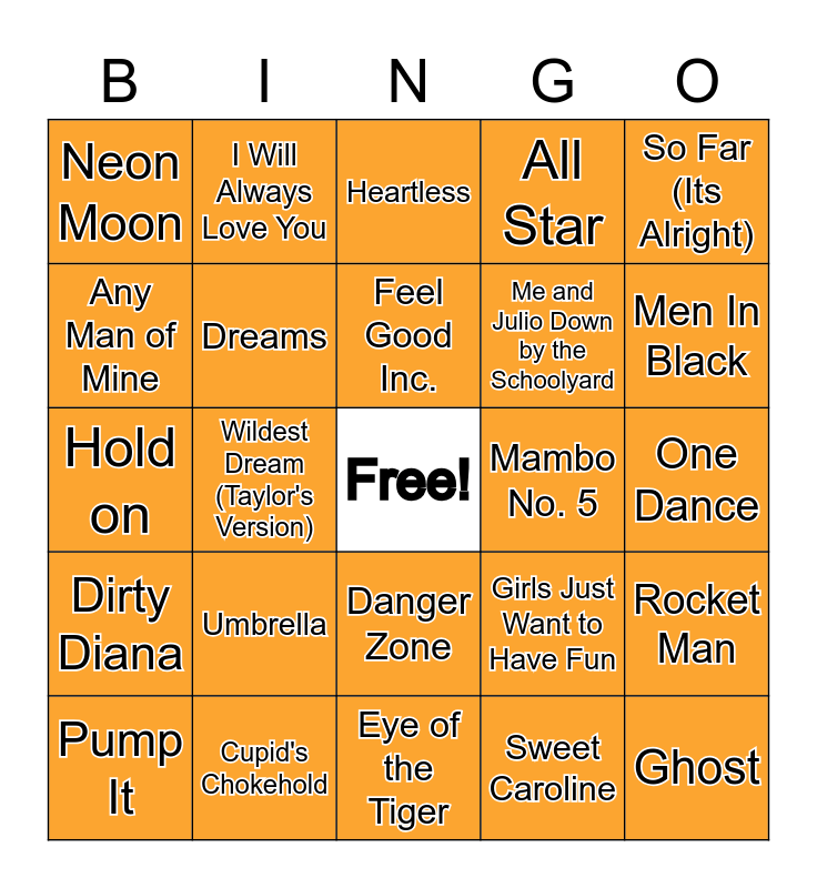This bingo card has a free space and 24 words: Umbrella, Cupid's Chokehold, Feel Good Inc., Pump It, So Far (Its Alright), Neon Moon, Any Man of Mine, I Will Always Love You, Mambo No. 5, Danger Zone, Me and Julio Down by the Schoolyard, Hold on, Girls Just Want to Have Fun, Rocket Man, Dreams, Sweet Caroline, One Dance, Heartless, Men In Black, Wildest Dream (Taylor's Version), Ghost, Dirty Diana, All Star and Eye of the Tiger.