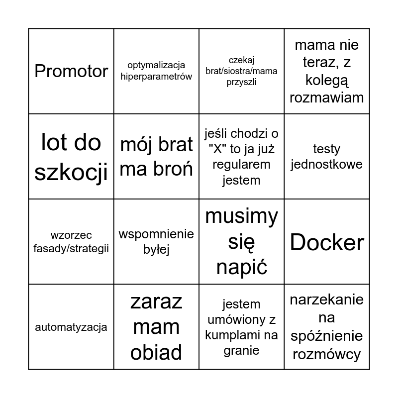 This bingo card has 16 words: zaraz mam obiad, Docker, czekaj brat/siostra/mama przyszli, Promotor, wzorzec fasady/strategii, optymalizacja hiperparametrów, musimy się napić, jestem umówiony z kumplami na granie, lot do szkocji, mój brat ma broń, automatyzacja, mama nie teraz, z kolegą rozmawiam, wspomnienie byłej, testy jednostkowe, jeśli chodzi o "X" to ja już regularem jestem and narzekanie na spóźnienie rozmówcy.