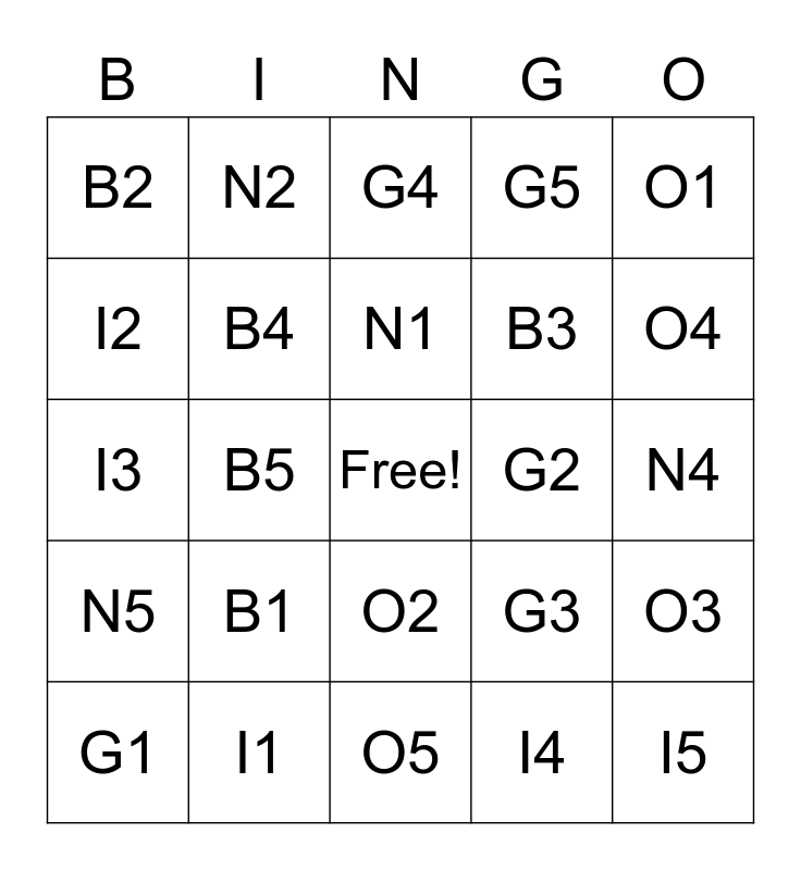 This bingo card has a free space and 24 words: B1, I1, N1, G1, O1, B2, I2, N2, G2, O2, B3, I3, G3, O3, B4, I4, N4, G4, O4, B5, I5, N5, G5 and O5.